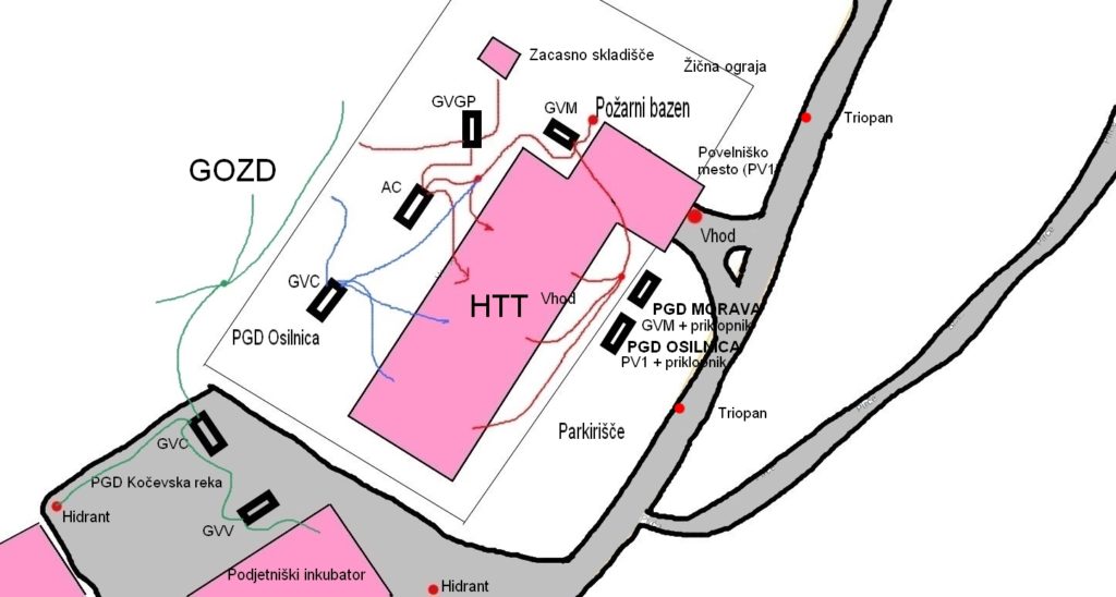 Na sektorski vaji se vsako leto zberemo 4 bližnja društva: PGD Morava, PGD Osilnica, PGD Kočevska Reka in PGD Vas-Fara. Vaja poteka v okviru meseca požarne varnosti. Obdelali smo že kar nekaj lokacij, saj vsako leto vajo pripravi drugo društvo na drugi lokaciji. Vletošnjem letu je bilo za izvedbo vaje zadolženo naše društvo. Na pobudo vodstva podjetja HTT smo vajo pripravili okoli njihove tovarne v Pirčah. Vodstvo podjetja je želelo, da v okviru vaje preizkusimo učinkovitost in uporabnost požarnega bazena, ki so ga zgradili zaradi neuporabnosti hidrantnega omrežja. Vajo je pripravil poveljnik PGD Vas-Fara, ki je bil tudi vodja intervencije. Vsi ostali z vajo niso bili seznanjeni in so navodila za delo dobili na samem kraju intervencije. Na sami vaji je sodelovalo 13 naših gasilcev z vsemi 4 vozili. Žal je sodelovanje na vaji odpovedala PGD Osilnica, zato smo samo vajo na kraju intervencije nekoliko spremenili. Po koncu vaje je sledil postroj in nagovor predstavikov GZ Kočevje. Članice pa so v prostorih PIK-a Kostel pripravile pogostitev za vse sodeloje gasilce, goste in opazovalce. Sponzor pogostitje je bilo prav tako podjetje HTT. Na vaji je sodelovalo 30 gasilcev s sedmimi vozili. Potek zamišljene vaje prikazuje spodnja taktična skica. |