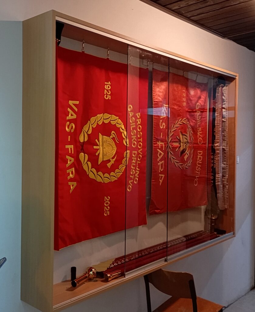 V letu 2025 smo praznovali 100-letnico društva. Ob tej priložnosti smo razvili nov prapor. Odločiti smo se, da stari in novi prapor shranimo v zato posebej narejeni vitrini. Tudi tokrat je vitrino izdelal naš član Aloj Klobučar. Nahaja pa se hodniku, ki povezuje nadstrešek z garažami.